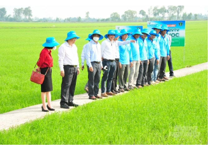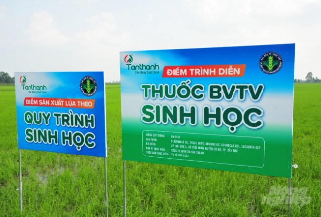 Mô hình “Trình diễn thuốc BVTV sinh học trên đồng ruộng” của Công ty Tân Thành hợp tác với bà con nông dân ở xã Thới Xuân, huyện Cờ Đỏ (TP Cần Thơ). Ảnh: Lê Hoàng Vũ.