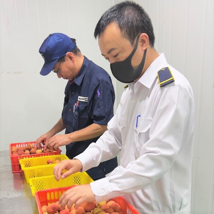 Chuyên gia Nhật Bản cùng cán bộ kiểm dịch thực vật (Cục BVTV) kiểm tra lô vải thiều trước khi xuất khẩu. Ảnh: NgôThu Hồng