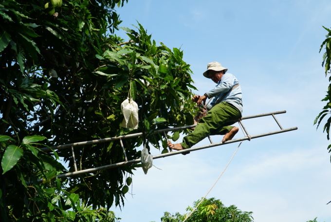 "Việc này rất nhọc công nhưng hiệu quả mang lại lớn nên nhà vườn khắc phục khó khăn", ông Lộc nói. Bên cạnh bao trái, nông dân phải tuyệt đối tuân thủ quy trình sản xuất sạch, minh bạch đầu vào - ra bằng nhật ký canh tác, không sử dụng thuốc trong danh mục cấm, chỉ thu hoạch xoài khi hết thời gian cách ly sau phun thuốc...