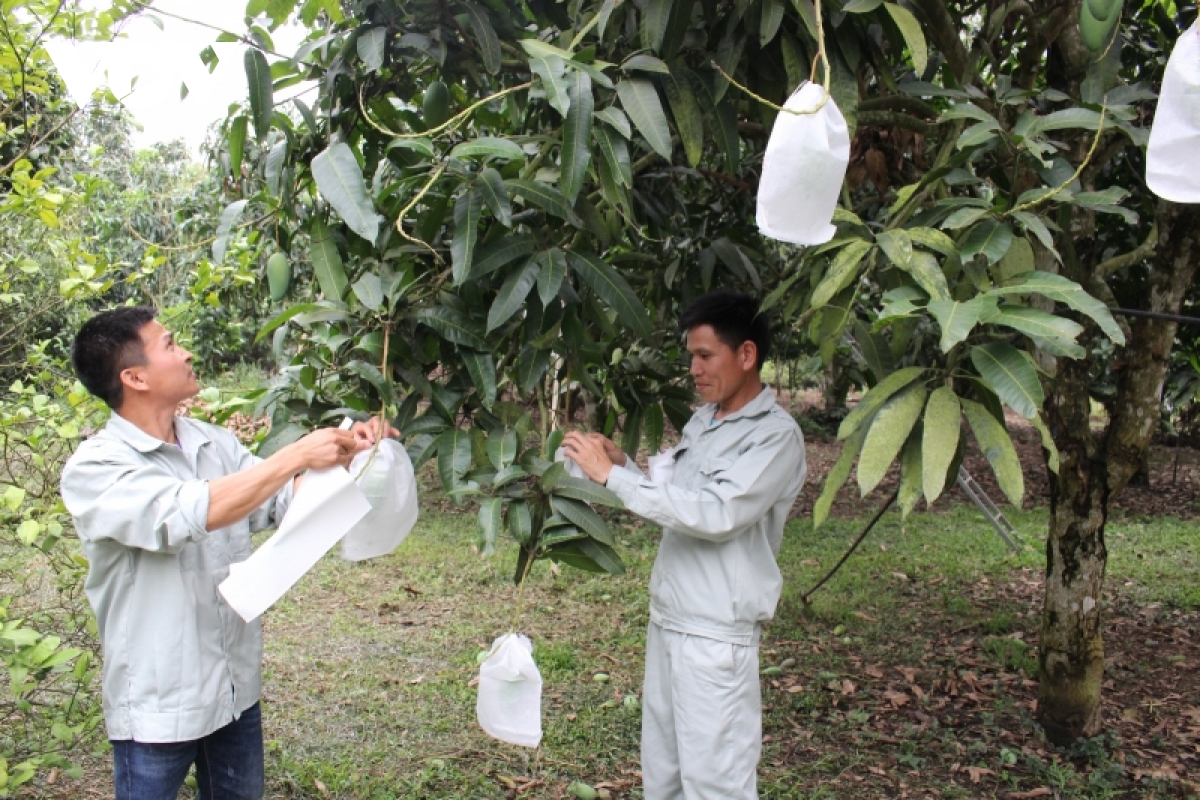 Nông dân Yên Châu bao trái xoài, đảm bảo chất lượng xuất khẩu.
